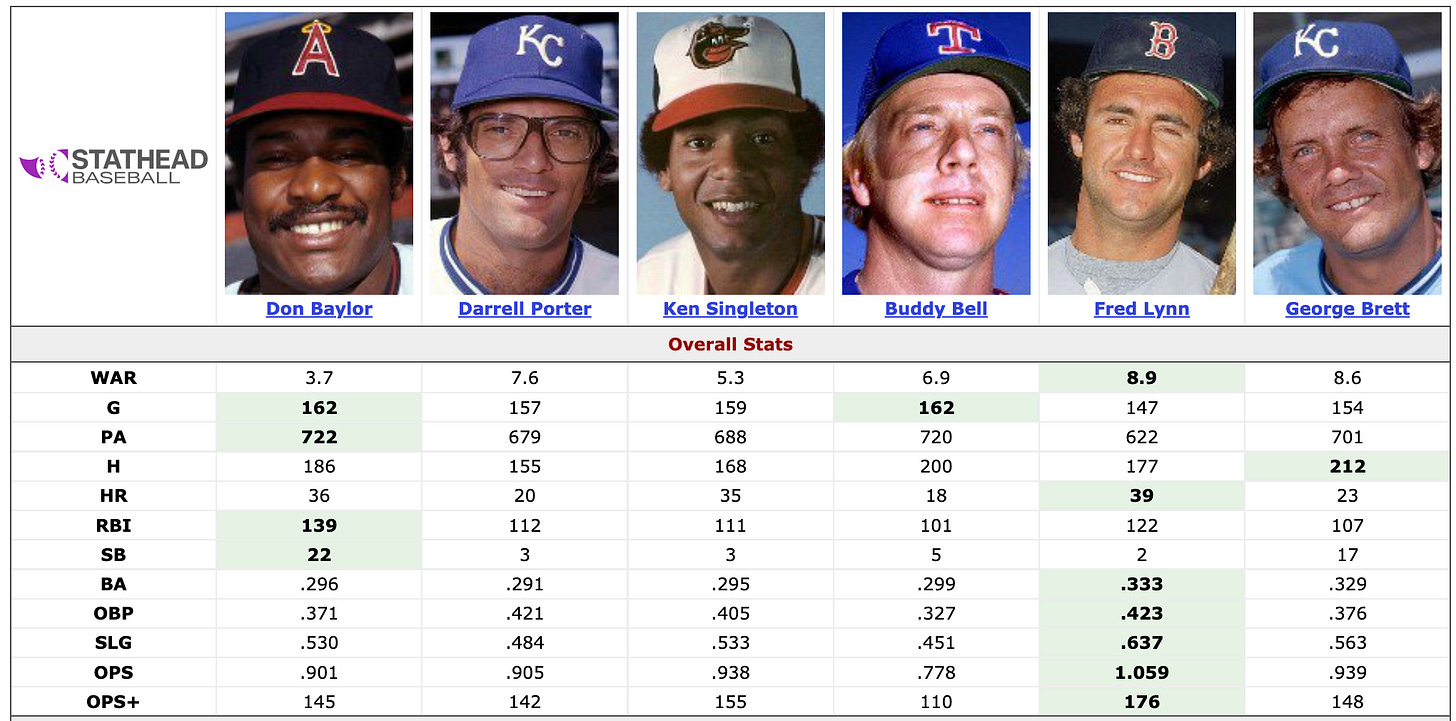 But he wasn’t remotely the best player in the American League. As I said, Lynn had a much better year, but so did George Brett, and Darrell Porter, and Jim Rice, and Buddy Bell, and Willie Wilson, and Ken Singleton. I mean, look: