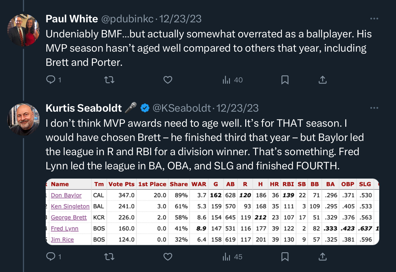 I think he brings up a good point here. Not about Baylor, per se, because I still think there were better players that season in the American League. We agreed later in the exchange that Fred Lynn probably would have won the award if they evaluated players in 1979 the way we do now.