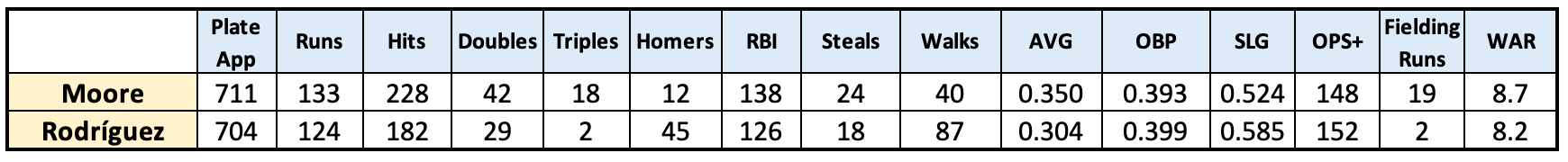 Obviously we don’t have the full statistics of every game Moore played between those ages because he played them for the Kansas City Monarchs in the Negro National League, and complete league records aren’t available. But we do know that on a per-162-game basis, Moore was every bit the all-around player Rodríguez was.