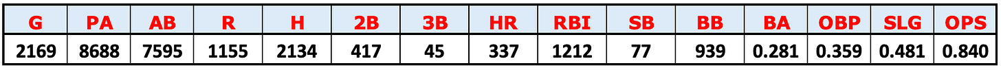 For fun, let’s see what would have happened if he’d played 20 more games per year after leaving Boston. That’s ten seasons once we add the strike-shortened 1981 year, so it’s an extra 200 career games. This time I won’t put him back in Fenway Park, I’ll just project out his actual numbers each of those years. Doing that gives him these career totals: